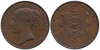С 1841 года для острова чеканятся свои монеты. На фотографии медная монета номиналом в 1/13 джерсийского шиллинга, 1851 г. На реверсе герб Джерси.