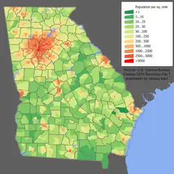 По данным переписи 2020 года, население Джорджии составляет 10 725 274 человек[1]. Согласно переписи, белые американцы составляют около 65 % населения штата, афроамериканцы — 29,6 %, лица азиатского происхождения — 2,8 %[6]. На 2005 год 90 % населения Джорджии говорит дома только на английском, 5,6 % — говорит на испанском. Третий по распространённости родной язык — французский (0,9 %), за ним немецкий (0,8 %) и вьетнамский (0,6 %).