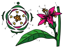 Диаграмма цветка. 1 — ось соцветия, 2 — прицветник, 3 — чашелистик, 4 — лепесток, 5 — тычинка, 6 — гинецей, 7 — кроющий лист.