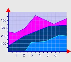 Диаграммы-области — это тип диаграмм, схожий с линейными диаграммами способом построения кривых линий. Отличается от них тем, что область под каждым графиком заполняется индивидуальным цветом или оттенком. Преимущество данного метода в том, что он позволяет оценивать вклад каждого элемента в рассматриваемый процесс. Недостаток это типа диаграмм также схож с недостатком обычных линейных диаграмм — искажение относительных изменений показателей динамики с равномерной шкалой ординат[7].