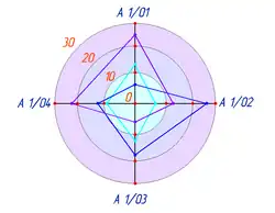 В отличие от линейных диаграмм, в радиальных или сетчатых диаграммах более двух осей. По каждой из них производится отсчёт от начала координат, находящегося в центре. Для каждого типа полученных значений создаётся своя собственная ось, которая исходит из центра диаграммы. Радиальные диаграммы напоминают сетку или паутину, поэтому иногда их называют сетчатыми. Преимущество радиальных диаграмм в том, что они позволяют отображать одновременно несколько независимых величин, которые характеризуют общее состояние структуры статистических совокупностей. Если отсчёт производить не с центра круга, а с окружности, то такая диаграмма будет называться спиральной диаграммой[5][8].