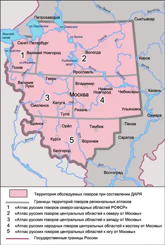 Для составления ДАРЯ была выбрана территория только центра Европейской части России[~ 3], на которой размещены сплошным массивом наиболее ранние русские поселения (примерно до XVI века), где формировались ядро русской нации, русский национальный язык и его основные диалекты[5], черты которых начали складываться в феодальную эпоху и отчасти в период племенного деления восточных славян (так называемые говоры первичного образования). Причинами выбора ограниченной территории расселения русских явились: