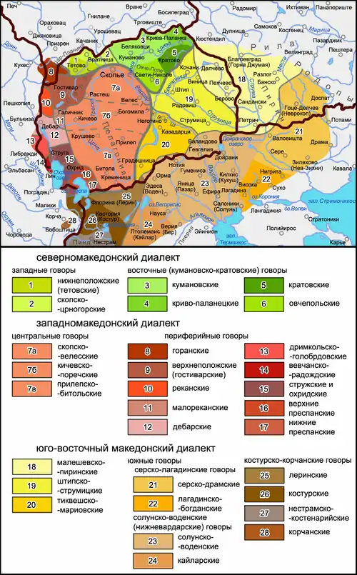 В Болгарии носители македонских диалектов считаются болгарами, в Греции — греками-«славянофонами»[12]. В болгарской языковедческой традиции литературный язык македонцев рассматривается как региональная норма болгарского языка, а македонские диалекты чаще всего считаются частью болгарских диалектов. Македонский ареал, например, показан как часть болгарского языкового ареала на диалектологической карте, опубликованной Институтом болгарского языка в 2014 году[13]. В Греции до 1980-х годов македонские говоры находились под запретом, в настоящее время этот запрет снят, тем не менее, существование македонского языка и его диалектов официально не признаётся[14][15].