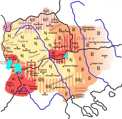 Кроме того, македонская диалектная территория разделяется на несколько ареалов в зависимости от развития древних сочетаний *tj, *kt, *dj. В северных и центральных диалектах на месте указанных сочетаний сформировались согласные /ќ/ и /ѓ/. В периферийных южных, западных и восточных — сформировались сочетания /št/, /žd/ или /šč/, /žǯ/, /š’č’/, /ž’ǯ’/[29].
