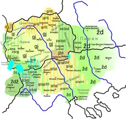Согласно диалектологической карте болгарского языка, малешевско-пиринскому ареалу приблизительно соответствует ареал благоевградских говоров, штипско-струмицкому ареалу — ареал штипско-радовишских говоров, тиквешско-мариовскому ареалу — ареалы мариовских и неготинских говоров. Все указанные говоры включаются в состав а-говоров юго-западной подгруппы западноболгарской диалектной группы. Солунско-воденскому ареалу соответствуют ареалы гевгелийских и кукушско-воденских не-а-говоров юго-западной подгруппы и ареал западнорупских восточноболгарских солунских говоров[13][25][26]. Тиквешско-мариовские говоры восточномакедонского ареала иногда включают в переходную полосу говоров, размещённых между западным и восточным диалектными ареалами[14].