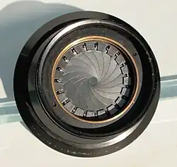 Диафра́гма объекти́ва (от греч. διάφραγμα — перегородка) в оптических приборах — разновидность апертурной диафрагмы, позволяющая регулировать относительное отверстие объектива изменением диаметра проходящих через него пучков света[1]. Такая регулировка используется для управления светопропусканием и глубиной резкости. Диафрагма объектива представляет собой непрозрачную перегородку с круглым отверстием переменного диаметра, центр которого совпадает с оптической осью[* 1]. Регулировка диаметра отверстия может выполняться тремя основными способами[2]: