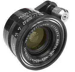 В зарубежных источниках заводная диафрагма получила название «полуавтоматической» (англ. Semi Automatic Diaphragm). Однако, широкого распространения система не получила из-за внедрения в фотоаппаратах зеркала постоянного визирования, возвращающегося в рабочее положение после срабатывания затвора. Это вынудило разработчиков сделать прыгающую диафрагму также самовозвратной, то есть не требующей взвода после каждого снимка[29]. В результате диафрагма автоматически открывается после срабатывания, и в видоискателе постоянно наблюдается яркое изображение при полном отверстии[33][* 5]. Впервые полностью автоматическая диафрагма с внутренним приводом реализована в 1956 году в немецком Praktisix[34]. В том же году такая диафрагма появилась в резьбовых объективах для малоформатных Praktica и Contax-S[27]. В СССР самовозвратную диафрагму первоначально называли «моргающей», а за рубежом «автоматической» (англ. Fully Automatic Diaphragm, Fully Automatic Lens)[35]. Поэтому иностранные объективы первых серий с таким приводом диафрагмы часто содержали в названии слово «Auto»: например, Nikkor Auto, Auto-Takumar, Auto Rokkor и т. д. Советская оптика с моргающей диафрагмой получила в названиях дополнительную букву «М»[36].
