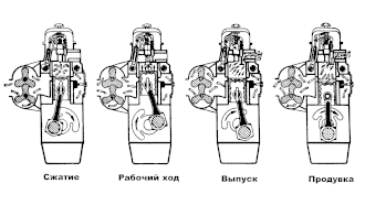• 1-й такт. Впуск. Соответствует 0°—180° поворота коленвала. Через открытый приблизительно на 345—355° впускной клапан воздух поступает в цилиндр, на 190—210° клапан закрывается. При этом до 10—15° поворота коленвала одновременно открыт и выхлопной клапан. Время совместного открытия клапанов называется перекрытием клапанов, при котором происходит продувка цилиндра сжатым воздухом (адиабатически сжатым в турбокомпрессоре и охлаждённым изобарно в интеркулере для снижения удельного объёма и увеличения соответственно количества окислителя, подаваемого в цилиндр, и также снижения работы, затрачиваемой на такте сжатия) из впускного коллектора для удаления продуктов сгорания.