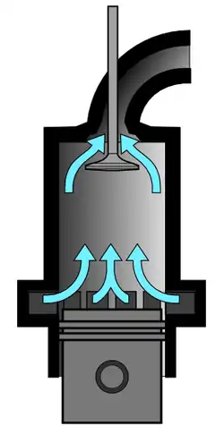 Клапанно-щелевая продувка двухтактного дизельного двигателя: внизу — продувочные окна, выпускной клапан вверху открыт