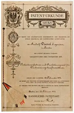 Патент, выданный Рудольфу Дизелю на его изобретение