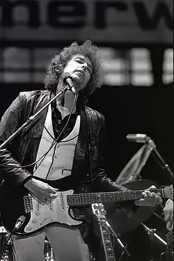 В ноябре 1976 года Дилан появился на прощальном концерте группы The Band, гостями этого шоу стали такие артисты, как Мадди Уотерс, Ван Воррисон и Нил Янг. Мероприятие, организованное в бальном зале Winterland в Сан-Франциско, было снято режиссёром Мартином Скорсезе и выпущено в качестве документального фильма «Последний вальс». Половину концерта заняло выступление Дилана[217]. В том же году Дилан написал песню «Sign Language», которую исполнил вместе с Эриком Клэптоном на его пластинке No Reason to Cry[218].