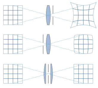 В наименьшей степени дисторсия проявляется у симметричных объективов за счёт расположения диафрагмы между линзами[5]. Под симметрией объектива подразумевается симметрия формы и расположения линз относительно плоскости апертурной диафрагмы, перпендикулярной оптической оси.