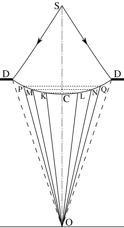 Рассмотрим случай дифракции света от точечного источника S, который проходит сквозь круглое отверстие DD и падает на экран, где наблюдается дифракционная картина в точке О, в которой ось симметрии системы пересекает экран. Сферический волновой фронт разрежем коническими поверхностями OKL, OMN, OPQ и т. д. так, чтобы длины образующих этих конусов OK, OM, OP отличались друг от друга на половину длины волны. Таким образом волновой фронт разрезается на зоны Френеля. Свет, приходящий в точку O из любых двух соседних зон при интерференции даёт минимум. Поскольку количество света пропорционально площади зоны, а зоны эти имеют приблизительно одинаковую площадь (так как разность хода в половину длины волны мала по сравнению с размерами отверстия и расстояниями в оптической системе), этот минимум соответствует почти полному гашению света[13]. Таким образом, в монохроматическом свете[15]:
