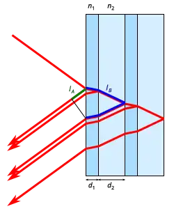 Действие диэлектрического зеркала основано на интерференции световых лучей, отражённых от границ между слоями диэлектрического покрытия. Простейшие диэлектрические зеркала являются одномерным фотонным кристаллом, образованным чередующимися слоями с бо́льшим и меньшим показателем преломления (см. схему), т. е. являются Брэгговским отражателем. Толщины слоёв выбираются таким образом, чтобы имела место конструктивная интерференция , т. е сложение всех отражённых от границ структуры лучей. Для этого толщины слоёв делают такими, чтобы оптическая длина пути (, см.рисунок) в каждом из них была кратна , где — показатель преломления слоя, — его геометрическая толщина, — длина волны. Обычно, но не всегда, оптическая длина пути во всех слоях составляет четверть длины волны. Тот же принцип используется для создания многослойных просветляющих покрытий, в которых толщины слоёв выбираются так, чтобы минимизировать, а не максимизировать отражение.