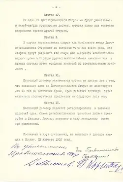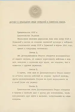 Догово́р о ненападе́нии ме́жду Сове́тским Сою́зом и Герма́нией (нем. Deutsch-sowjetischer Nichtangriffsvertrag; также известен как пакт Мо́лотова — Ри́ббентропа или как пакт Сталина — Гитлера[1]) — межправительственное соглашение, подписанное в Кремле в первые часы 24 августа 1939 г.[2][3] (документ датирован 23 августа 1939 г.) главами ведомств по иностранным делам Советского Союза и Германии. Ранее подобные договоры с Германией подписали Польша (1934), Великобритания (1938), Франция (1938), Литва (1939), Латвия (1939), Эстония (1939); позднее — Турция (1941)[комм. 1]. Советский Союз также подписал договор о ненападении с Польшей в 1932 году.
