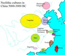 В центральном Китае около 6000 года до н. э. различались три культуры среднего неолита: Цышань в провинции Хэбэй, Пэйлиган к югу от Жёлтой реки в провинции Хэнань, и Дадивань в долине Вэйшуй в провинции Шэньси. В те времена климат там был более тёплым и влажным, чем в настоящее время. Данные культуры культивировали просо (Setaria italica). Они также собирали плоды и орехи, в том числе грецкий орех (Juglans regia) и лесной орех (Corylus leteraphylea). В качестве домашних животных держали собак и свиней. Найдено большое количество костей банкивских кур (Gallus gallus), что указывает также на птицеводство.