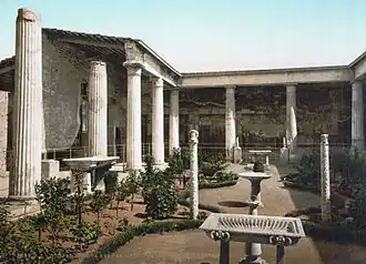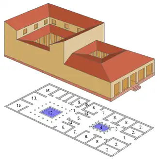 - Атриум (лат. atrium, от ater — «закопчённый», «чёрный», то есть помещение, почерневшее от копоти) — крытый двор со световым колодцем (комплювий) над бассейном (имплювий)[5]. За имплювием, несколько поодаль, складывали очаг с таким расчётом, чтобы огонь не заливало дождевой водой, а дым вытягивало наружу, позднее очаг из этой комнаты исчез. Изначально атриум был местом сна матери семейства. Напротив входа в дом была глубокая ниша для её кровати, смотревшая на атрий с глубокой нишей — lectus adversus («ложе против дверей»). Римляне сохраняли эту нишу как знак святости брака. Ткацкий станок стоял в атрии в старозаветных семьях до конца республики. Здесь хранились ценности рода: тяжёлый сундук с семейными ценностями (денежный ящик), стол типа жертвенника (картибул; Варрон вспоминал, что в его детстве они ещё встречались), и шкаф (ниши) для хранения восковых масок (imagines) и бюстов предков, а также изображений добрых духов-покровителей — ларов и пенатов (позже отдельное святилище — ларарий). Затем атриум превратился в публичную, приёмную часть дома, парадный зал. Был наиболее богато обставленной частью дома. Сохранившиеся карнизные кольца свидетельствуют, что этот зал делили в случае необходимости занавесями и портьерами на отдельные пространства. Существовали различные типы атриума[6]: