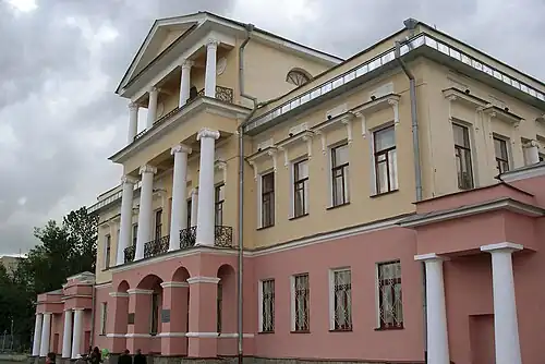 Главный фасад двухэтажного дома, украшенного трёхъярусным портиком и мезонином, обращён к пруду. На высоте первого этажа проходит рустованная аркада по столбам; на уровне второго этажа портик представляет собой ионическую колоннаду. Мезонин украшен третьим ярусом портика — тонкими коринфскими колонками. Портик завершается треугольным фронтоном. Симметрично поставленные по обеим сторонам здания ворота создают целостную композицию.