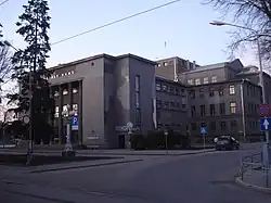 Памятник архитектуры 30-х годов XX века. Построено по инициативе Карлиса Улманиса на бывшей Александровской площади перед Собором Александра Невского. Строительство здания начато 15 мая 1936 года, на сооружение здания пошло 600 вагонов кирпича. Строительство закончено 19 декабря 1937 года. Проект архитектора В. Витанда. Изображен на марке ЛР 1939 года.