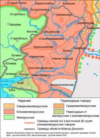 Говоры Донской группы размещены в районах позднего формирования русских диалектов к юго-востоку от ареала распространения диалектов раннего формирования на территории западной части Волгоградской области и большей части Ростовской области[8].