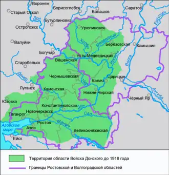 Территория области Войска Донского с наложением контуров современных Ростовской и Волгоградской областей[1][2]