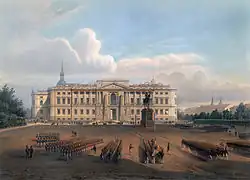 В мае 1837 года отец отвёз братьев Михаила и Фёдора в Петербург и определил их в приготовительный пансион К. Ф. Костомарова для поступления в Главное инженерное училище[85]. Михаил и Фёдор Достоевские желали заниматься литературой, однако отец считал, что труд писателя не сможет обеспечить будущее старших сыновей, и настоял на их поступлении в инженерное училище, служба по окончании которого гарантировала материальное благополучие. В «Дневнике писателя» Достоевский вспоминал, как по дороге в Петербург вместе с братом «мечтали мы только о поэзии и о поэтах», «а я беспрерывно в уме сочинял роман из венецианской жизни»[86]. Старший брат в училище не был принят. Младший же учился с тяготою, не испытывая никакого призвания к будущей службе. В том же году их отец в чине коллежского советника оставил службу (за время которой был награждён орденами Св. Владимира 4-й степени — 1829 и Св. Анны 2-й степени — 1832[87]) и поселился в Даровом, где в 1839 году, при до конца не выясненных обстоятельствах скончался.