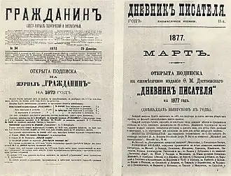 С начала 1861 года Фёдор Михайлович помогал брату Михаилу издавать собственный литературно-политический журнал «Время»[182], после закрытия которого в 1863 году братья начали выпускать журнал «Эпоха». На страницах этих журналов появились такие произведения Достоевского, как «Униженные и оскорблённые» (1861)[183], «Записки из мёртвого дома»[184], «Скверный анекдот» (1862)[185], «Зимние заметки о летних впечатлениях» (1863)[186] и «Записки из подполья» (1864)[187]. Сотрудничество в журналах «Время» и «Эпоха» положило начало публицистической деятельности Достоевского, а совместная работа с Н. Н. Страховым[188] и А. А. Григорьевым[189] способствовала становлению братьев Достоевских на позициях почвенничества.