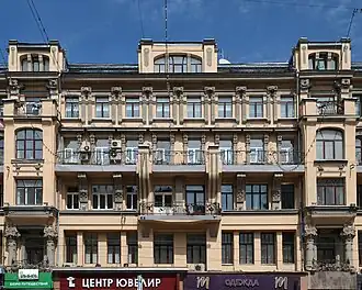 Пятиэтажное здание делилось на две части. На первых двух этажах находились магазины, а остальных трёх — жилые комнаты. На первом этаже работал магазин братьев Пате. Здесь продавались патефоны и фонографы. Также на первом этаже работала фотостудия «Отто Ренар». За этим домом, для товарищества Гиппиус построил 4 доходных дома. Их квартиры сдавались в аренду[3][2].