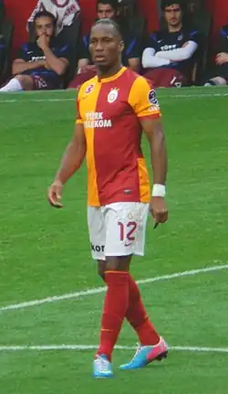 Как позже отмечал Дидье, на его переход именно в «Галатасарай» повлияли и другие факторы: сильный тренер — Фатих Терим, полузащитник Уэсли Снейдер, перешедший в том же январе из «Интернационале», а также на тот момент уже несколько лет находившийся в «Галатасарае» друг Дрогба — Эммануэль Эбуэ. Сыграл свою роль в привлекательности команды и современный стадион — «Тюрк Телеком Арена»[148]. 15 февраля Дидье дебютировал в составе «Галатасарая»: он вышел со скамейки запасных в игре против «Акхисар Беледиеспор», и после подачи углового смог головой забить свой первый гол за свою новую команду, итоговый счёт матча — 2:1[149][150]. Впоследствии Дрогба выступил и в Лиге чемпионов 2012/13 года. «Галатасараю» удалось выйти из своей группы, в 1/8 финала обыграть «Шальке 04» и во второй раз в истории команды выйти в четвертьфинал данного турнира. В нём соперником турецкого клуба стал «Реал Мадрид», который в то время возглавлял Жозе Моуринью, бывший тренер Дидье. В первом матче «Галатасарай» проиграл 0:3, вторая игра с испанской командой завершилась победой 3:2, один из голов в том матче забил сам Дрогба. Тем не менее «Галатасарай» не смог пройти дальше по сумме голов в обоих встречах[151]. В начале мая Дрогба выиграл свой первый трофей в составе «Галатасарая», им стал кубок чемпионата Турции, который удалось получить после победы в игре с «Сивасспором» (4:2)[152]. В начале августа 2013 года «Галатасарай» одержал победу в турнире Emirates Cup, в рамках которого турецкая команда встретилась с лондонским «Арсеналом». Дрогба забил в той игре два мяча, и, таким образом, довёл счёт своим голам в матчах против «канониров» до 15, которые ему удалось забить в аналогичном количестве встреч. В том же месяце был проведён матч за Суперкубок Турции 2013, в нём Дидье забил единственный и победный гол в ворота принципиального противника «Галатасарая» — «Фенербахче»[153]. В начале сезона 2013/14 года команду покинул главный тренер Терим, его сменил Роберто Манчини. Под его руководством клуб смог одержать победу в Кубке Турции, а также пройти в плей-офф Лиги чемпионов, несмотря на две сильные команды в группе — «Ювентус» и «Реал Мадрид». Соперником «Галатасарая» в 1/8 финала стал «Челси», который вновь возглавлял Моуринью, покинувший «Реал» перед началом сезона. Первый матч проходил в Стамбуле и завершился со счётом 1:1. Во второй игре Дрогба впервые вернулся на «Стэмфорд Бридж» после ухода из «Челси», и, по его признанию, возникшие эмоции повлияли на то, что он провёл невыразительный матч против бывшей команды. В турецкой лиге «Галатасарай» финишировал вторым[154]. По окончании сезона 2013/14 года контракт Дрогба с «Галатасараем» подошёл к концу, и он в итоге не стал его продлевать[155]. За два сезона в турецком клубе Дрогба провёл 53 матча во всех турнирах, в которых забил 20 голов[147].