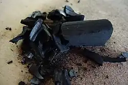 Древесный уголь для пороха получают путём обжига (пиролиза) несмолистых пород дерева (ольха и особенно крушина) с получением продукта, на 80—90 % состоящего из углерода; применение смолистой древесины отрицательно сказывается на свойствах пороха, да и хвойные породы не склонны к образованию угля. Однако хвойные дрова применяют для инициации процесса горения с последующей засыпкой древесины иных пород при историческом способе производства древесного угля. До XIX века выжигание древесного угля производилось в угольных ямах, не позволявших получать однородный по своим свойствам продукт (ввиду наличия одновременно и недожжённой (не пиролизованной), и пережжённой древесины (то есть золы)). И только внедрение пиролиза в стальных ретортах с водяным замком позволило получать гарантированно качественный уголь, при этом лучшими сортами древесины для получения угля считались бук, граб, дуб для тяжёлых углей и берёза в смеси с осиной для лёгких. В зависимости от наличия древесины той или иной породы в данной местности и развития производства угля формировались национальные требования и особенности производства чёрного пороха, поскольку именно качество древесины и степень обжига угля в значительной степени определяют качество пороха. Чем ниже степень обжига угля, тем меньше скорость его горения, что не всегда отрицательный фактор. Содержание чистого углерода в угле должно быть не менее 75—80 %; известно, что при снижении количества угля в порохе скорость его горения возрастает, но с увеличением процента углерода в угле — уменьшается. В охотничьих сортах чёрного пороха содержание селитры иногда немного увеличивали, например, французский и немецкий охотничьи пороха содержали 78 % селитры, 10 % серы и 12 % угля. В «минных» сортах (для производства взрывных работ), наоборот, содержалось больше серы и угля; например, в России применялась смесь из 66,6 % селитры, 16,7 % серы и 16,7 % угля[10]. Порох, использовавшийся в примитивных ракетах XIX века, давал более высокие показатели импульса при повышенном содержании селитры. И наоборот, при снижении количества селитры в порохе эти показатели снижались[13]. В целом с увеличением количества селитры в порохе возрастает и скорость его горения, но до определённого предела — не выше 80 %[14].