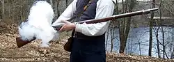 Вспышка дымного пороха на по́лке любительского мушкета современного производства