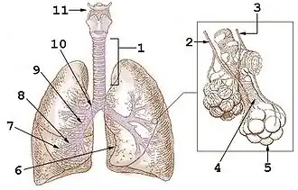 1 — трахея; 2 — лёгочная вена (несёт к сердцу кровь, обогащённую кислородом); 3 — лёгочная артерия (приносит от сердца кровь, богатую углекислым газом); 4 — бронхиола и альвеолярные ходы; 5 — альвеолы; 6 — плевра; 7 — дольковые бронхи; 8 — сегментарный (третичный) бронх; 9 — долевой бронх; 10 — правый главный бронх; 11 — гортань