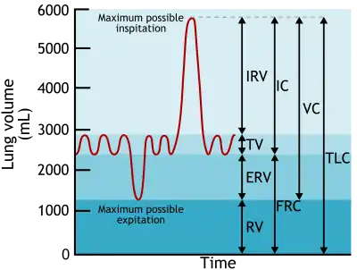 Объёмы лёгких. Обозначены: TLC — общая ёмкость, VC — жизненная ёмкость, TV — дыхательный объём, IRV — резервный объём вдоха, ERV — резервный объём выдоха, RV — остаточный объём, IC — ёмкость максимального вдоха, FRC — функциональная остаточная ёмкость. Красной линией — спирограмма спокойного дыхания, максимальных выдоха и вдоха