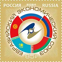 Эмблема Евразийского экономического союза (центр) и флаги стран союза : России, Армении, Беларуси, Казахстана и Кыргызстана на почтовой марке России 2024 года (ЦФА [АО «Марка»] 3262)