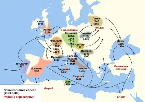 18 июля 1290 года король Англии Эдуард I издал указ об изгнании из страны всех евреев (число которых в стране на тот момент не превышало 4000). Большинство беженцев переехали во Францию, Фландрию и Германию. Указ был отменён только в 1652 году Оливером Кромвелем[35].
