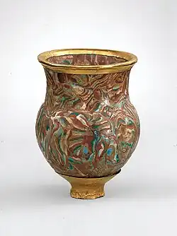 Фаянс изготовлялся с додинастического периода до XIV века н. э. и был очень широко использован для небольших предметов типа бисера или мелких статуэток. Самыми популярными предметами обычно были скарабеи и фигурки Ушебти. Большими изделиями обычно были чашки и миски, а также настенные плитки, в основном использовавшиеся для храмов[8].