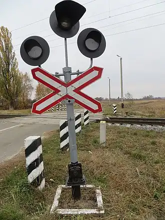 Знак, устанавливаемый непосредственно перед переездами всех категорий, кроме пятой, имеет форму равноконечного креста с перекладинами, расположенными под углом 90° друг к другу. На переездах с двух- и многопутными железными дорогами над крестом устанавливается V-образный знак.