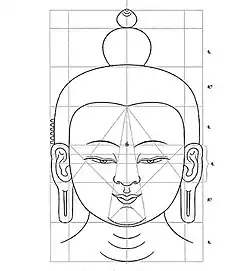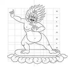 Единицей измерения тела божеств была ладонь, а единицей измерения ладони — «ангула» (размер средней фаланги среднего пальца). Напр. в индийском трактате «Читралакшана» пропорции тела чакравартина измерялись по системе «наватала» (9 ладоней), трактат «Пратимаманалакшана» рекомендовал систему «дашатала» (10 ладоней), 30-я глава комментария Ратнаракшиты на «Самварудайю» для изображения тела Будды предлагала систему «дашатала» (10 ладоней), но с модулем в 12,5 ангула. Тибетские теоретики ввели стабильный модуль — 12,5 ангула для высшей группы в иерархии божеств (система 10 ладоней); 12 ангула — для средней группы божеств (система 10 ладоней) и для всех остальных применявшихся в тибетском искусстве систем в 9, 8, 7, 6, и 5 ладоней.