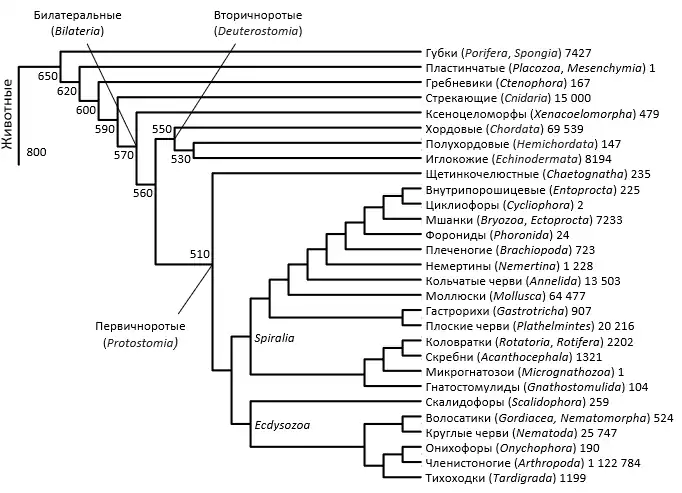 Вторичноро́тые (лат. Deuterostomia) — группа многоклеточных животных из группы Bilateria, включает полухордовых, иглокожих и хордовых. Термин введён немецким зоологом К. Гроббеном (1908)[48]. У вторичноротых в период зародышевого развития на месте первичного рта (бластопора) образуется анальное отверстие, а собственно рот независимо появляется в передней части тела. Есть вторичная полость тела (целом). К ним относятся в том числе и наиболее прогрессивные (с позиции эволюционного учения) животные — позвоночные (подтип хордовых). Однако происхождение вторичноротых неясно. Возможно, они произошли от радиальных (кишечнополостных) животных независимо от первичноротых. Согласно другим гипотезам, предками вторичноротых были представители одного из примитивных типов первичноротых, объединяемых в группу низших червей. Но последние данные молекулярных исследований говорят в пользу первой версии[49].