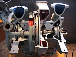 Турбонасосный агрегат (ТНА) ЖРД-ракеты Фау-2 в разрезе. Ротор турбины посредине. Роторы насосов по бокам от него