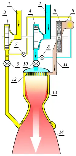 Компоненты топлива — горючее (1) и окислитель (2) поступают из баков на центробежные насосы (3, 4), приводимые в движение газовой турбиной (5). Под высоким давлением компоненты топлива поступают на форсуночную головку (12) — узел, в котором размещены форсунки, через которые компоненты нагнетаются в камеру сгорания (13), перемешиваются и сгорают, образуя нагретое до высокой температуры газообразное рабочее тело, которое, расширяясь в сопле, совершает работу и преобразует внутреннюю энергию газа в кинетическую энергию его направленного движения. Через сопло (14) газ истекает с большой скоростью, сообщая двигателю реактивную тягу.