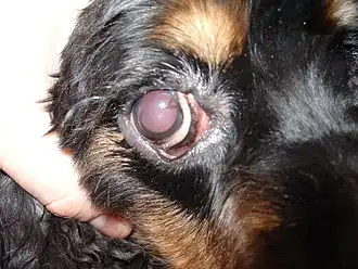 | Экзофтальм | смещение глазного яблока вперёд (выпученные глаза), в некоторых случаях со смещением в сторону | [5][16] | |