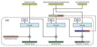 В режиме CBC уже существует взаимодействие при обработке различных смежных блоков, поэтому заимствование шифротекста имеет меньшее концептуальное влияние.[3] Ошибка в одном бите при передаче его по каналу связи приведет к полному повреждению блоков и . Ошибка в одном бите изменит соответствующий бит и полностью повредит .