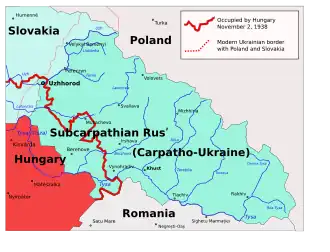 С 22 ноября 1938 года получила статус автономной единицы, однако часть её территории с наибольшими городами Ужгород, Мукачево и Берегово была передана в состав Венгрии, по результатам Первого Венского Арбитража. После аннексии Германией Судетской области Чехословакии (см. Мюнхенское соглашение 1938) в Закарпатье 15 марта 1939 года премьер-министром автономного правительства Подкарпатской Руси Августином Волошиным было провозглашено независимое государство — Карпатская Украина. В тот же день были введены венгерские войска и край вновь включён в состав Венгрии.