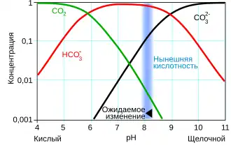 В океане около 1 % неорганического углерода содержится в угольной кислоте и двуокиси углерода, около 91 % в ионах гидрокарбоната () и около 8 % в ионах карбоната (). Диоксид углерода, растворенный в воде, находится в равновесии с гидрокарбонатом, карбонатом и ионами оксония (ионами гидроксония) по следующим уравнениям реакции: