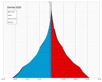 Население Замбии составляет около 19,61 миллиона человек по последней переписи населения 2022 года, из которых бемба — 21,5 %, тонга — 11,3 %, лози — 5,2 %, другие — 45,9 %.[14]. Плотность населения 19,3 человек на км². В городах проживает 39,2 % населения страны (2011)[14].