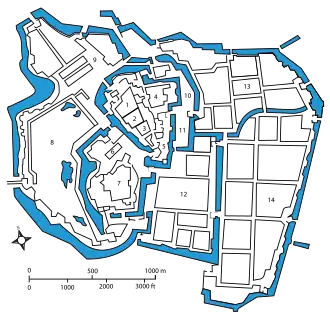 ![]() Замок Эдо, окружённый жилыми дворцами и рвами (картина XVII века) | |