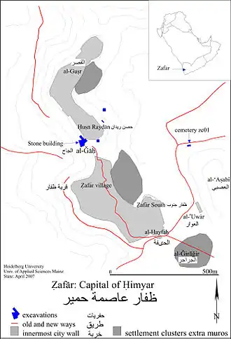 - ↑ Paul Yule, Kristina Franke, Cornelius Meyer, G. Wilhelm Nebe, Christian Robin. Zafar, Capital of Himyar, Ibb Province, Yemen: First Preliminary Report: Summer 1998 and Autumn 2000, Second Preliminary Report: 2002, Third Preliminary Report: 2003, Fourth Preliminary Report: 2004 // Archäologische Berichte aus dem Yemen. — 2007. — Т. 11. — doi:10.11588/propylaeumdok.00000127. Архивировано 15 августа 2019 года.