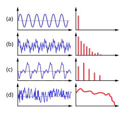 Под спектром понимается распределение звуковой энергии по частоте , то есть функция, показывающая относительную представленность различных частот в изучаемом звуке. Если это распределение дискретное, то записывается как сумма дельта-функций вида ; в таком случае может быть приведён перечень присутствующих частот с их вкладами в общую интенсивность: и так далее.