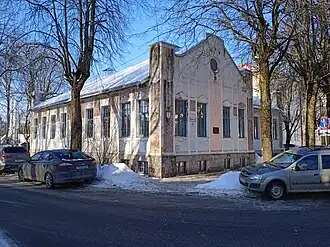 По композиции здание асимметрично. Скатные крыши перпендикулярны друг другу. Здание мыслится двухэтажным, первый этаж — цокольный. В основном объёме главный фасад завершен высоким фронтоном, который фланкирован башенками. На фоне гладких поверхностей стен здания выделяются филенки, образованные переплетениями штукатурных тяг[2].